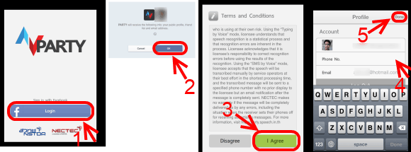 PARTY-Thai Speech-to-Text-p01จากนั้นเลือกที่ Login เพื่อ ลงทะเบียนใช้งานด้วยบัญชี facebook  โดยแอพ facebook นี้จะเข้าถึง โปรไฟล์สาธารณะของเรา รายชื่อเพื่อนบน facebook และที่อยู่อีเมลของคุณ  แล้วก็อ่านเงื่อนไขข้อตกลงการใช้งาน ให้ตอบ I Agree  ตามหมายเลข 3  และใส่ข้อมูลเบอร์โทรให้เรียบร้อย ตามด้วยแตะปุ่ม Done ตามขั้นตอนที่ 4 และ 5 บนรูปตามลำดับ