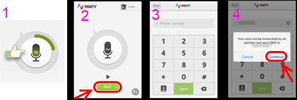 PARTY-Thai Speech-to-Text-p03คราวนี้ก็ถึงเวลาการใช้งานจริง ก็เริ่มอัดเสียงกันโดยกดที่ ไอคอนไมโครโฟนของแอพ Party ดังรูป เพื่อเริ่มบันทึกเสียง ให้เราพูดภาษาไทยที่ต้องการให้แอพงส่ง sms ดู เสร็จแล้วก็แตะไอคอนไมค์อีกที แล้วแตะที่ Next แล้วกดเบอร์โทรศัพท์มือถือปลายทางที่คุณต้องการจะส่งข้อความ SMS ถึง แอพก็จะส่งข้อความภาษาไทย ตามที่เราได้พูดบนแอพเมื่อสักครู่