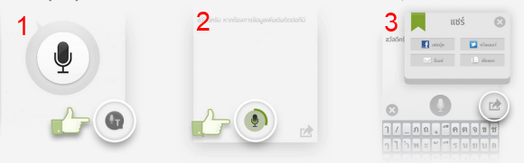 PARTY-Thai Speech-to-Text-p04นอกจากนี้ยังมีอีกโหมดนึงคือ พิมพ์ด้วยเสียงเรา  – ขั้นตอนการใช้งานไม่ยาก ให้แตะที่ไอคอนตามรูป 1 แล้วแตะที่ไอคอนไมค์เพื่อเริ่มพูด เมื่อพูดเสร็จก็แตะไอคอนไมค์อีกครั้ง ระบบก็จะประมวลผลสิ่งที่คุณพูดเมื่อสักครู่ ไปยัง Server เพื่อถอดข้อความออกมาแบบสดๆ (อาจไม่แม่นนักในช่วงทดสอบแต่ก็พิมพ์เป็นภาษาไทยให้ ) เมื่อ ok แล้ว สามารถแก้ไขข้อความได้ก่อน แตะที่ไอคอนแชร์ เพื่อแชร์ขึ้น facebook , twitter อีเมล หรือทำการคัดลอกข้อความเพื่อไปใช้วางข้อความบนโปรแกรมอื่นๆได้