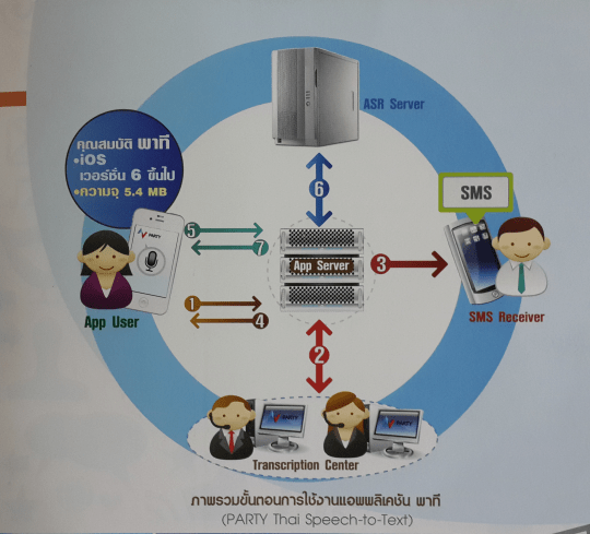 PARTY-Thai Speech-to-Text-p05โดยกระบวนการจากนี้แอพจะส่งไปยัง Server ให้ระบบ พนักงานถอดข้อความ  Transcription Center ) เปิดฟังเสียงและถอดออกมาเป็นข้อความ และข้อความนั้นก็จะส่งถึงเบอร์ SMS ปลายทาง และเมื่อส่งถึงปลายทางแล้ว จะมีอีเมลแจ้งกลับไปยังผู้ใช้แอพด้วย